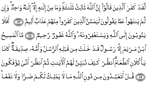 73. Andolsun, "Allah üçün üçüncüsüdür" diyenler küfre düşmüştür. Oysa tek bir İlah'tan başka İlah yoktur. Eğer söylemekte olduklarından vazgeçmezlerse, onlardan inkar edenlere mutlaka (acı) bir azap dokunacaktır.