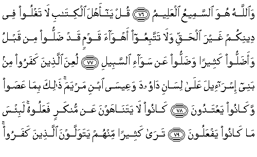 77. De ki: "Ey Kitap Ehli, haksız yere dininiz konusunda aşırı gitmeyin ve daha önce sapmış, birçoğunu saptırmış ve dümdüz yoldan kaymış bir topluluğun heva (istek ve tutku)larına uymayın."