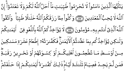 87. Ey iman edenler, Allah'ın sizin için helal kıldığı güzel şeyleri haram kılmayın ve haddi aşmayın. Şüphesiz Allah, haddi aşanları sevmez.