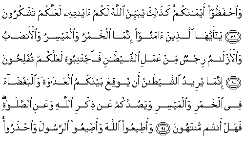 90. Ey iman edenler, içki, kumar, dikili taşlar ve fal okları ancak şeytanın işlerinden olan pisliklerdir. Öyleyse bun(lar)dan kaçının; umulur ki kurtuluşa erersiniz.