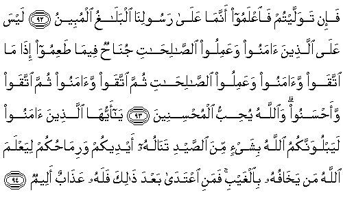 93.İman edenler ve salih amellerde bulunanlar için korkup-sakındıkları, iman ettikleri ve salih amellerde bulundukları, sonra korkup-sakındıkları ve iman ettikleri ve sonra (yine) korkup-sakındıkları ve iyilikte bulundukları takdirde (yasaklanmadan önce) dedikleri dolayısıyla bir sorumluluk yoktur. Allah, iyilik yapanları sever.
