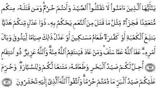 95.Ey iman edenler, siz ihramlıyken avı öldürmeyin. Sizden kim onu kasıtlı olarak (taammüden) öldürürse, cezası, hayvandan öldürdüğünün bir benzeridir. Buna da, Kabe'ye ulaşmış bir kurbanlık olarak içinizden adalet sahibi iki kişi hükmedecektir. Veya yoksulları doyurmak veya onun dengi oruç tutmak olan bir kefaret vardır. Böylelikle işlediğinin vebalini tatmış olsun. Allah geçmişte olanı bağışladı. Ama kim tekrarlarsa, Allah ondan öç alacaktır. Allah üstün ve güçlü olandır, öç sahibidir.