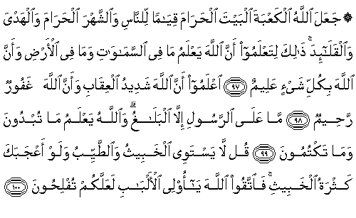97. Allah, Beyt-i Haram (olan) Kabe'yi insanlar için bir ayaklanma (kıyam evi) kıldı; Haram Ay'ı, kurbanı ve boyunlardaki gerdanlıkları da. Bu, Allah'ın göklerde ve yerde ne varsa tümünü bildiğini ve Allah'ın gerçekten herşeyi bilen olduğunu bilmeniz içindir.