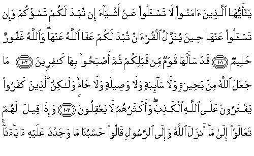 101.Ey iman edenler, size açıklandığında sizi üzecek şeyleri sormayın; Kur'an indirildiği zaman sorarsanız, size açıklanır. Allah onu affetti. Allah bağışlayandır, (kullara) yumuşak olandır.