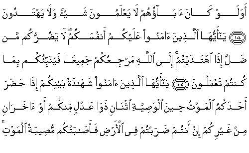 Ey iman edenler, üzerinizdeki (yükümlülük) kendi nefislerinizdir. Siz doğru yola erişirseniz, sapan size zarar veremez. Tümünüzün dönüşü Allah'adır. O, size yaptıklarınızı haber verecektir.