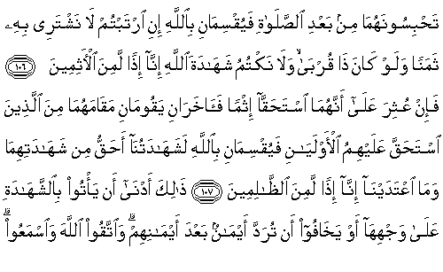 Ey iman edenler, sizden birinize ölüm gelip çattığı zaman, vasiyet hazırlanışında, aranızda içinizden adaletli iki kişiyi (şahid tutun.) Veya yolculukta olup size ölüm musibeti gelip çatarsa, sizden olmayan başka iki kişiyi (şahid tutun. İkisini) Şayet kuşkulanacak olursanız namazdan sonra alıkoyarsınız, onlar da (size): "Akraba dahi olsa onu (yeminimizi) hiçbir değere değiştirmeyeceğiz ve Allah'ın şahidliğini gizlemeyeceğiz. Aksi takdirde biz elbette günahkarlardan oluruz" diye Allah adına yemin etsinler.