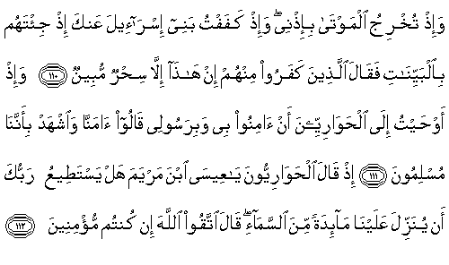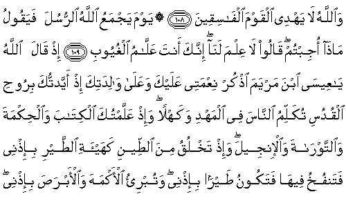 Allah şöyle diyecek: "Ey Meryem oğlu İsa, sana ve annene olan nimetimi hatırla. Ben seni Ruhu'l-Kudüs ile destekledim, beşikte iken de, yetişkin iken de insanlarla konuşuyordun. Sana Kitab’ı, hikmeti, Tevrat'ı ve İncil'i öğrettim. İznimle çamurdan kuş biçiminde (bir şeyi) oluşturuyordun da (yine) iznimle ona üfürdüğünde bir kuş oluveriyordu. Doğuştan kör olanı, alacalıyı iznimle iyileştiriyordun, (yine) Benim iznimle ölüleri (hayata) çıkarıyordun. İsrailoğulları’na apaçık belgelerle geldiğinde onlardan inkara sapanlar, "Şüphesiz bu apaçık bir sihirdir" demişlerdi (de) İsrailoğulları’nı senden geri püskürtmüştüm."