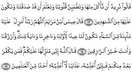 113.(Bu sefer Havariler:) "Ondan yemek istiyoruz, kalplerimiz tatmin olsun, senin de gerçekten bize doğru söylediğini bilelim ve buna şahidlerden olalım" demişlerdi.