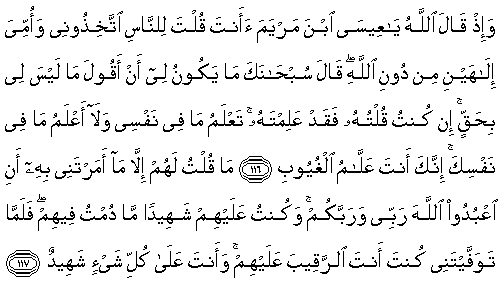 "Ben onlara bana emrettiklerinin dışında hiçbir şeyi söylemedim. (O da şuydu:) 'Benim de Rabbim, sizin de Rabbiniz olan Allah'a kulluk edin.' Onların içinde kaldığım sürece, ben onların üzerinde bir şahidim. Benim (dünya) hayatıma son verdiğinde, üzerlerindeki gözetleyici Sendin. Sen herşeyin üzerine şahid olansın.