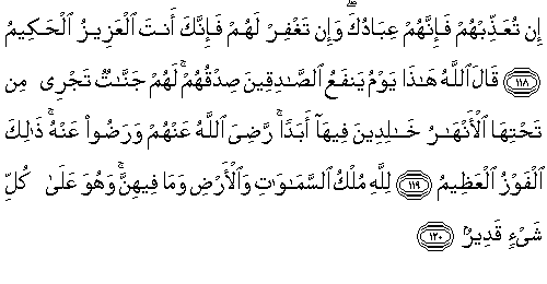 118.Eğer onları azaplandırırsan, şüphesiz onlar Senin kullarındır, eğer onları bağışlarsan, şüphesiz Aziz olan, hakim olan Sensin Sen."